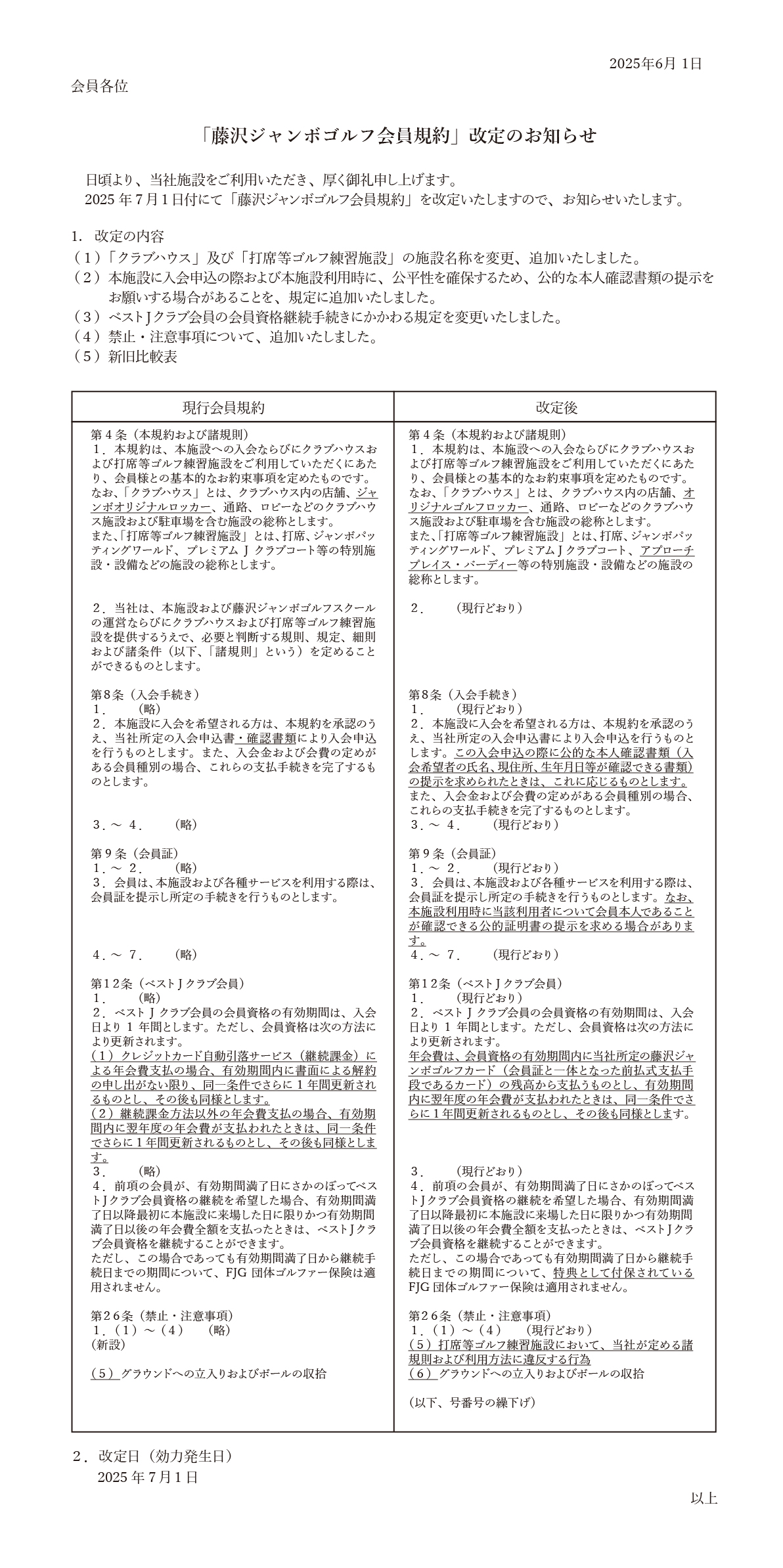 【藤沢ジャンボゴルフ会員規約改定】のお知らせ(2025年7月1日改定)
